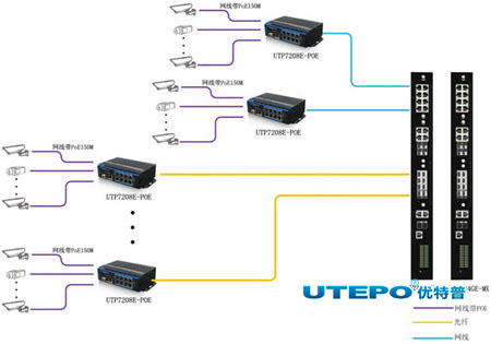 如圖所示:監(jiān)控系統(tǒng)的前端全部采用網(wǎng)絡(luò)高清攝像機(jī);接入端傳輸設(shè)備選用優(yōu)特普網(wǎng)電速聯(lián)7系PoE交換機(jī)UTP7208E-PoE;匯聚端則采用優(yōu)特普28口千兆模塊化網(wǎng)絡(luò)交換機(jī)UTP7524GE;接入端和匯聚端的交換機(jī)根據(jù)距離的不同合理選擇網(wǎng)線(xiàn)和光纖進(jìn)行網(wǎng)絡(luò)高清視頻信號(hào)的傳輸。