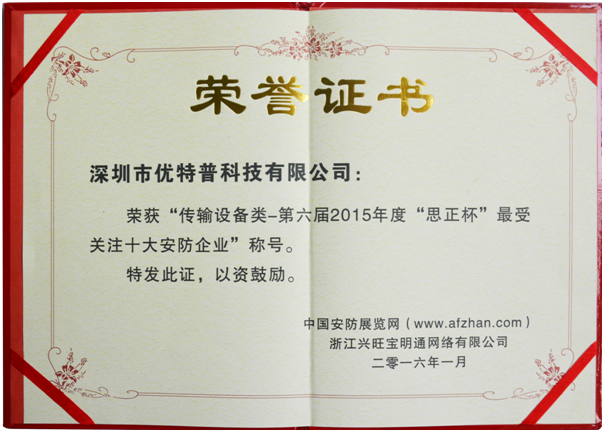 優(yōu)特普深耕安防行業(yè)十多年,始終堅持以“網(wǎng)電速聯(lián)匠心造,品質(zhì)問題零容忍” 的品質(zhì)觀念經(jīng)營企業(yè),使企業(yè)綜合實力得到快速發(fā)展。并且在研發(fā)實力、核心技術(shù)、創(chuàng)新產(chǎn)品、行業(yè)應(yīng)用、等方面都具有絕對的競爭優(yōu)勢。一路走來,優(yōu)特普佳績不斷,本次收獲“傳輸設(shè)備類最受關(guān)注十大安防企業(yè)”稱號,可謂錦上添花。展望未來,優(yōu)特普并不滿足于眼前的成就,力爭在技術(shù)與服務(wù)的不斷提升,緊緊圍繞著客戶的需求不斷地創(chuàng)新技術(shù)、改善服務(wù),以此創(chuàng)造更多優(yōu)質(zhì)的產(chǎn)品和服務(wù),并不斷引領(lǐng)傳輸設(shè)備領(lǐng)域向前發(fā)展。