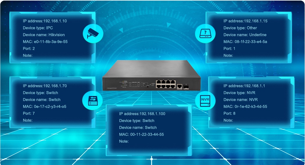 該產(chǎn)品支持ONVIF協(xié)議,可自動識別支持ONVIF的IP攝像機、網(wǎng)絡(luò)視頻錄像機(NVR)和其他支持ONVIF的IP設(shè)備,如網(wǎng)絡(luò)視頻解碼器等。通過LLDP協(xié)議在WEB界面自動生成一份虛擬拓?fù)湟晥D,用戶可通過拓?fù)鋱D了解其網(wǎng)絡(luò)連接的設(shè)備信息,如IP地址、設(shè)備類型、設(shè)備名稱、MAC地址等。