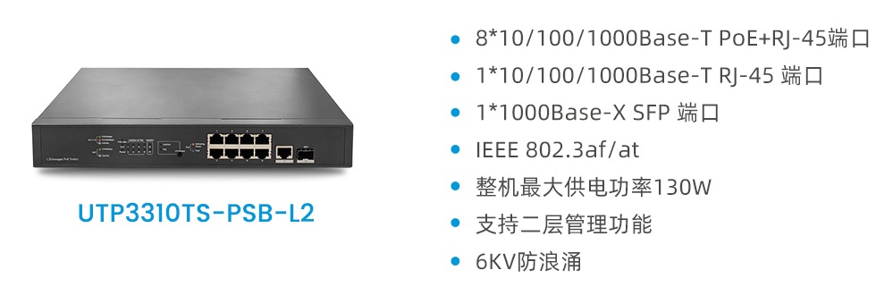 優(yōu)特普10口全千兆PoE二層管理型交換機可提供8個千兆以太網(wǎng)RJ-45 下聯(lián)端口,1個千兆以太網(wǎng)RJ-45和1個千兆以太網(wǎng)SFP上聯(lián)端口,所有RJ-45下聯(lián)以太網(wǎng)端口均支持以太網(wǎng)供電 (PoE+),每個端口可提供高達30W的功率,符合 IEEE 802.3af/at 標(biāo)準(zhǔn)。