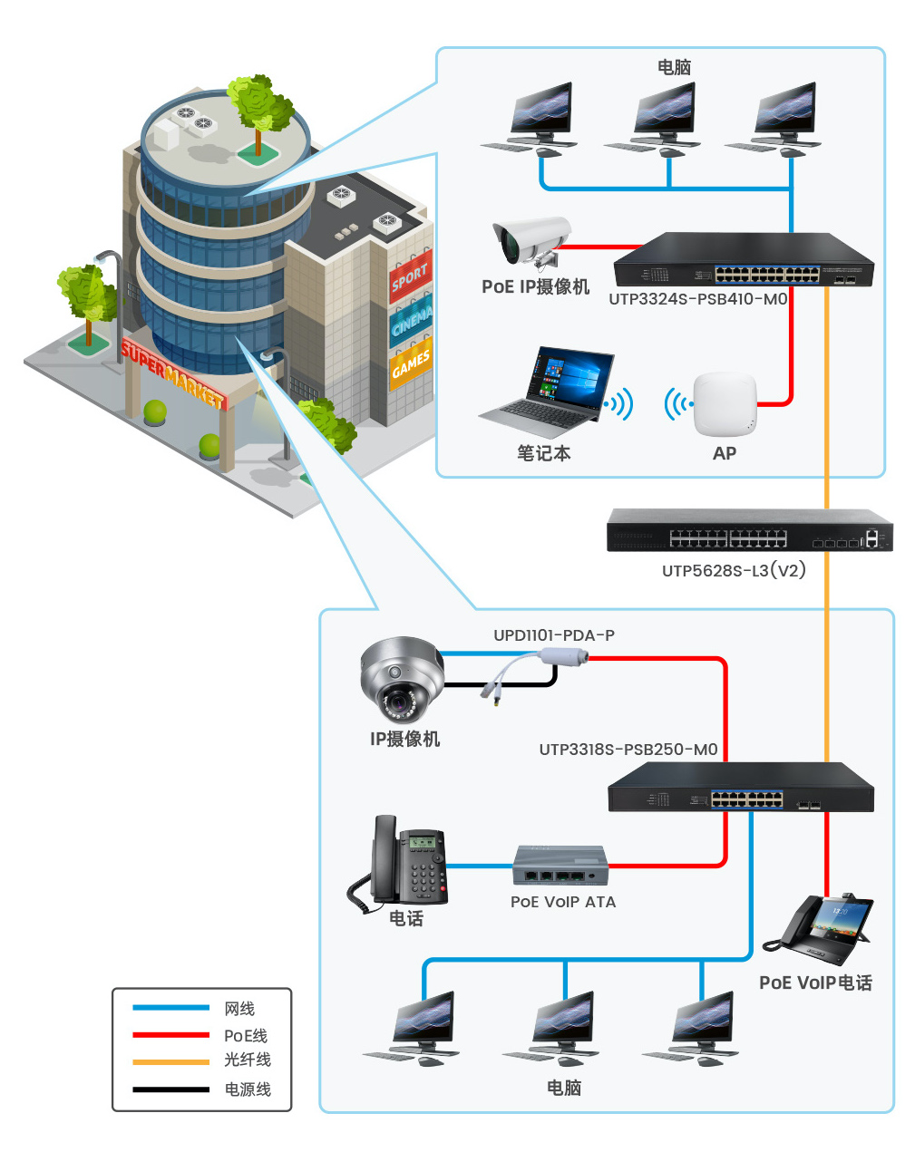 優(yōu)特普全千兆PoE交換機系列提供16/24個10/100/1000Base-T PoE供電端口,每個端口提供高達30W PoE功率,將電源和數(shù)據(jù)交換集成到一個單元中,使網(wǎng)絡設備擺脫了電源插座位置的限制和額外的交流布線,從而消除了部署的時間和成本。
