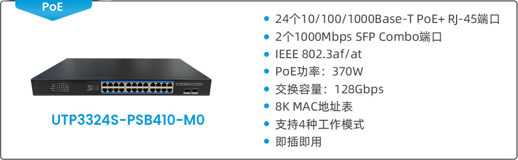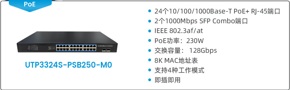 UTP3318-PSB250-M0的9-14下聯(lián)端口速率降為10Mbps,最遠傳輸距離延長至250米。UTP3324S-PSB250-M0, UTP3324S-PSB410-M0的17-22下聯(lián)端口速率降為10Mbps,最遠傳輸距離延長至250米。