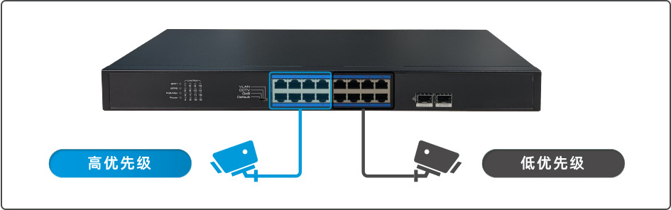 交換機的1-8端口為高優(yōu)先級端口。當交換機轉發(fā)的數(shù)據(jù)發(fā)生擁堵時,高優(yōu)先級端口上的數(shù)據(jù)將被首先轉發(fā)出去,從而保證了關鍵位置的視頻和數(shù)據(jù)的穩(wěn)定傳輸,不會出現(xiàn)中斷或滯后。