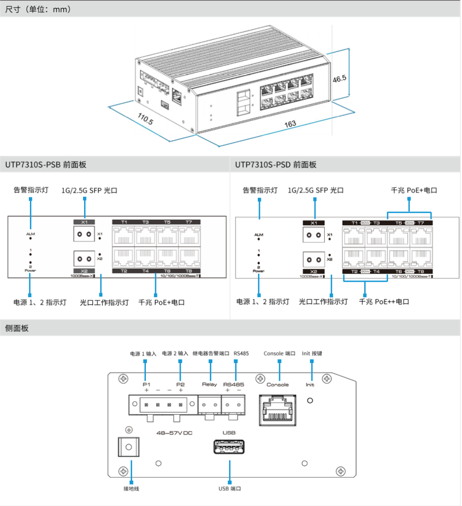 ● UTP7310S-PSD:4個10/100/1000 Base-T PoE++ RJ-45 端口