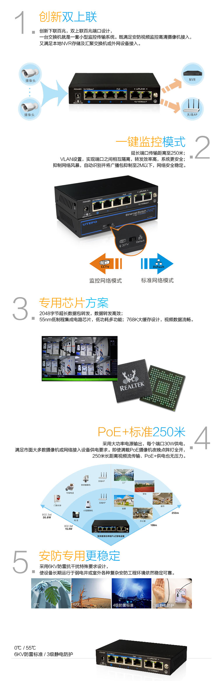 該系列交換機(jī)所有下聯(lián)以太網(wǎng)RJ-45端口均支持以太網(wǎng)供電(PoE +),每個(gè)端口可提供高達(dá)30W的功率,符合IEEE 802.3af/at標(biāo)準(zhǔn)。 該系列交換機(jī)支持一鍵CCTV功能,可廣泛用于視頻安全監(jiān)控系統(tǒng)及網(wǎng)絡(luò)項(xiàng)目中。